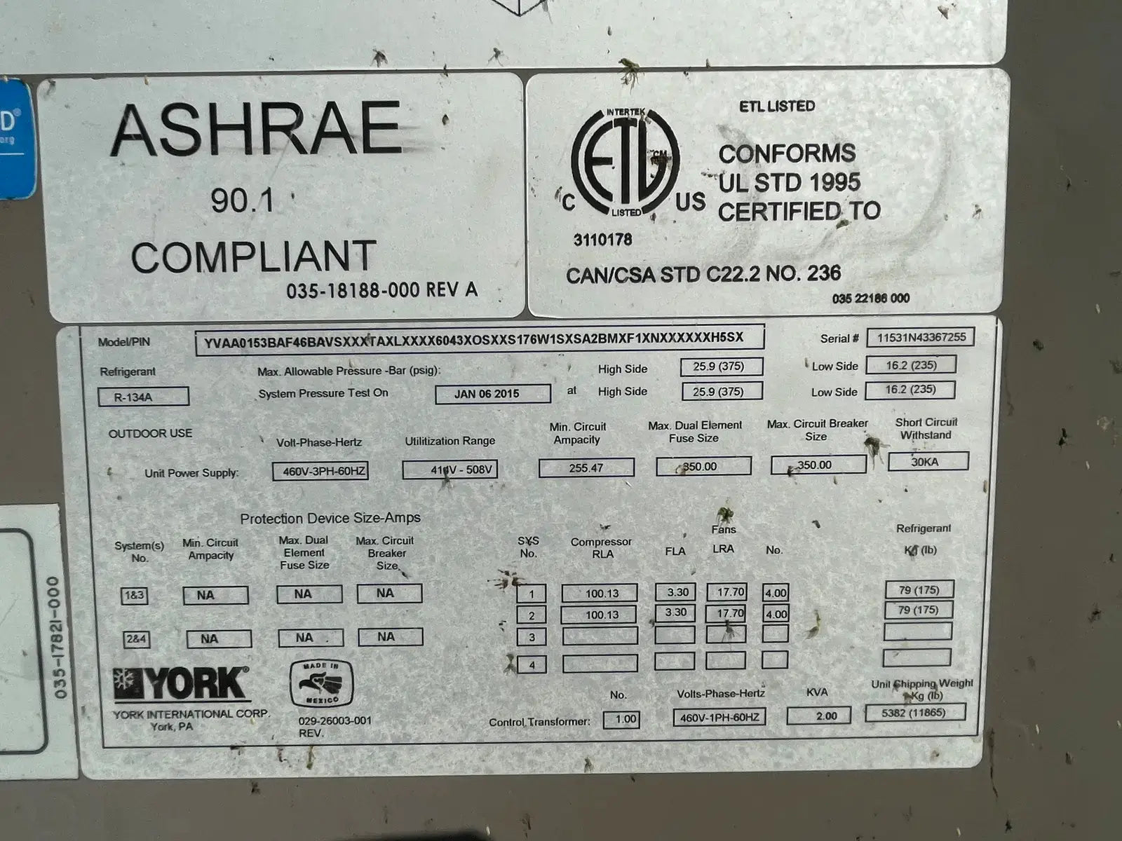 York YVAA Air- Cooled Screw Liquid Chiller. Model: YVAA0153BAF46. Serial No: 11531N43367255. Previous Refrigerant: R-134A. Leaving Water Temperature (Min/Max): 40/60 F. Maximum Water Side Pressure: 150 PSIG. Maximum Refrigerant Side Pressure: 235 PSIG. Evap Drain Connection: 3/4 in. Minimum Chilled Water Flow Rate: 250 GPM. Maximum Chilled Water Flow Rate: 950 GPM. Inlet and Water Connections: 6 in. Unit Power Supply: 460V-3PH-60Hz. Min.Circuit Amps: 255.47.