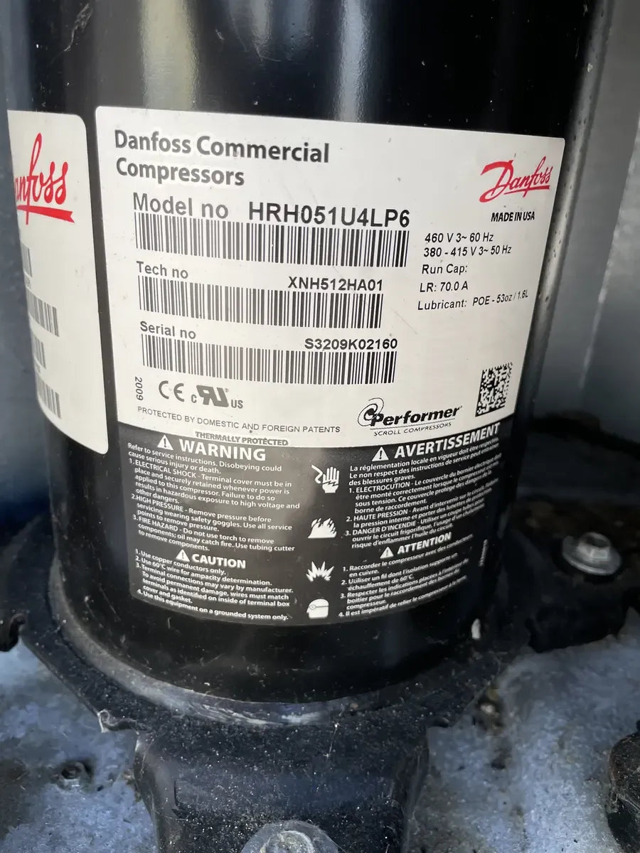 York Predator Air Cooling & Heating Condensing Unit. Model: ZH150N20S4AAC5A. Serial No: N1A0541529. Total Tonnage: 12.5. Unit Voltage: 460/3/60. Minimum Circuit Ampacity: 38.3. Maximum Fuse Size(Time Delay): 50. Max Circuit Breaker Size(HACR Type): 50. Minimum Test Pressure Charge: High Side: 445 PSIG, Low Side: 235 PSIG. Temperature Rise Degree(F): 25-55. Gas Input BTU/HR: 240,000. Minimum Input BTU/HR: 144,000. (2) Danfoss Scroll Compressors: Model: HLH068T4LC6, Power Voltage 460/3/60, LR: 87.0A.(1) Baldor Belt Drive Blower Motor: 5 HP, Volts: 208-230/460, RPM: 1750.