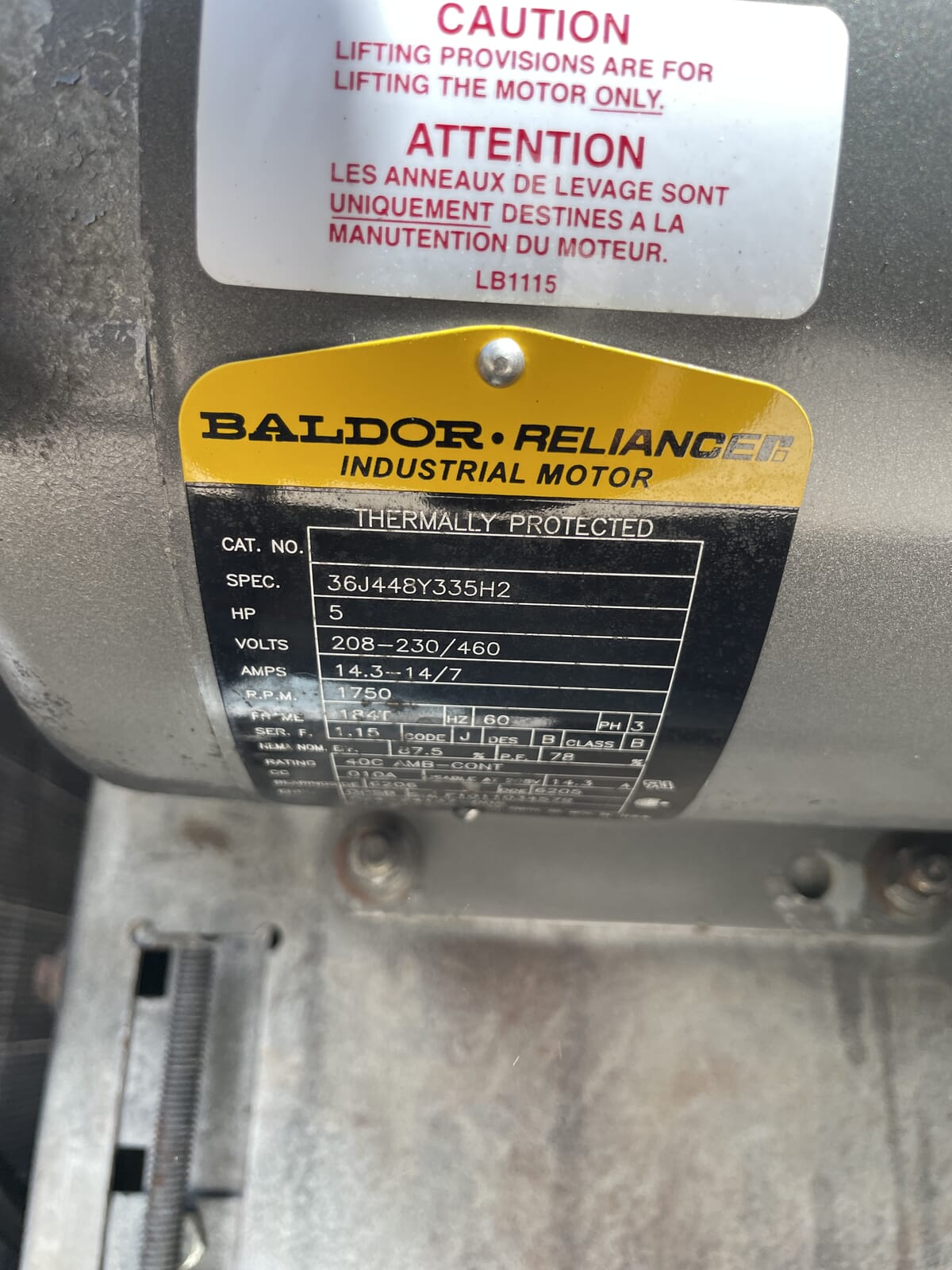 - If Multiple Motors, Motor Descriptions vs specs: (1) Baldor Belt Drive Blower Motor: 5 HP, Volts: 208-230/460, RPM: 1750.