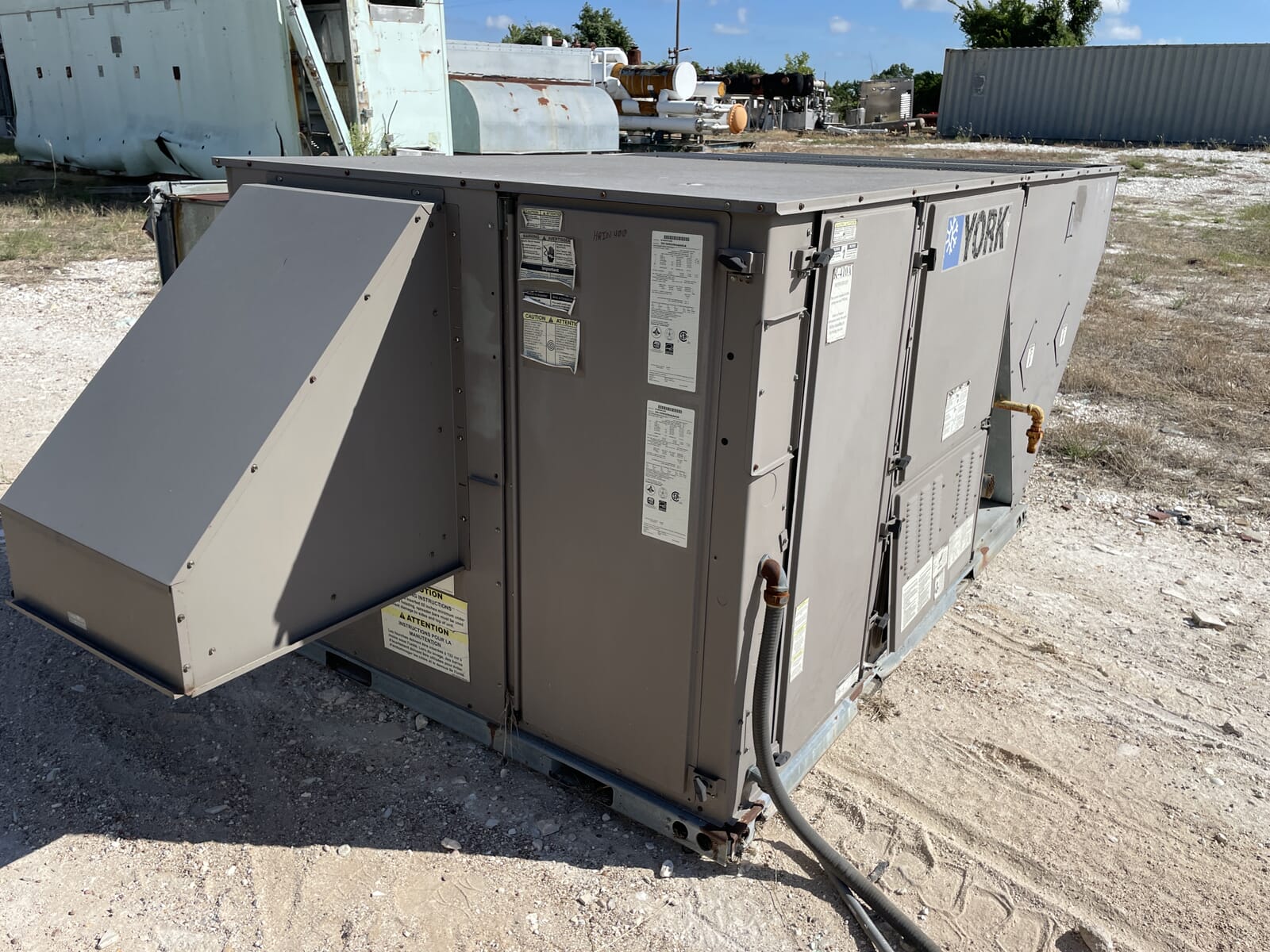 York Predator Air Cooling & Heating Condensing Unit. Model: ZH150N20S4AAC5A. Serial No: N1A0541529. Total Tonnage: 12.5. Unit Voltage: 460/3/60. Minimum Circuit Ampacity: 38.3. Maximum Fuse Size(Time Delay): 50. Max Circuit Breaker Size(HACR Type): 50. Minimum Test Pressure Charge: High Side: 445 PSIG, Low Side: 235 PSIG. Temperature Rise Degree(F): 25-55. Gas Input BTU/HR: 240,000. Minimum Input BTU/HR: 144,000. (2) Danfoss Scroll Compressors: Model: HLH068T4LC6, Power Voltage 460/3/60, LR: 87.0A.(1) Baldor Belt Drive Blower Motor: 5 HP, Volts: 208-230/460, RPM: 1750.