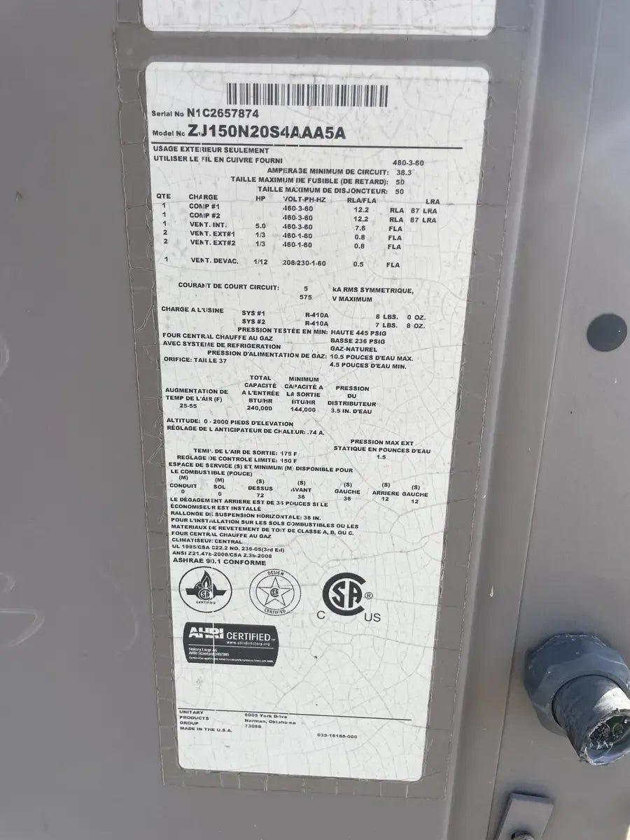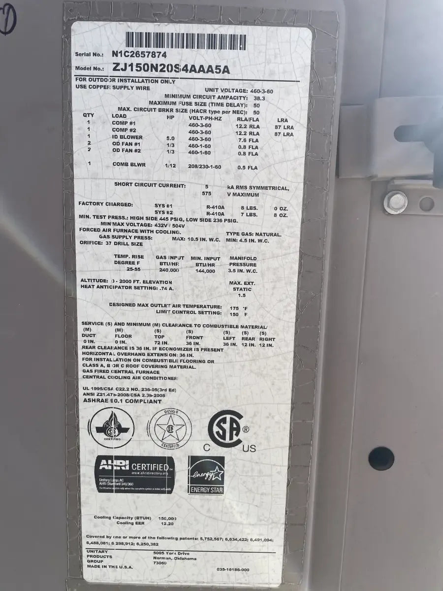 York Predator Air Cooling & Heating Condensing Unit. Model: ZJ150N20S4AAA5A, Serial: N1C2657874. Total Tons: 12.5. Unit Voltage: 460/3/60. Minimum Circuit Ampacity: 38.2. Maximum Fuse Size ( Time Delay): 50. Max Circuit Breaker Size(HACR Type): 50. Min. Test Pressure: High Side: 445 PSIG, Low Side: 236 PSIG. Min/Max: Voltage: 432v/504v. Type Gas: Natural. Temperature Rise Degree(F): 25-55. Gas Input(BTU/HR): 240,000. Min.Input(BTU/Hr): 144,000. Designed Max Outlet Air Temperature: 175 F. (2) Danfoss Scroll Compressor: Model: HLH068T4LC6, Voltage Power: 480v/3Ph/60Hz, LRA:87.0. (1) Baldor Fan Blower Motor: HP: 3/4, Volts: 203-230/460, RPM: 1750, Amp: 14-13.2/6.6, Hz: 60, Ph:3.