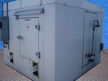 2001 York/Frigid Coil Roof-Top Freezer/Evaporator- 17 Ton. Model: RTFSL-201-103-LRB-HGU-IP-PCV. S/N: 39650A2R. Capacity: 9.5 Ton at -20°F with 10°F TD. Airflow: 15,730 cfm. Fan diameter: 34 in. Lincoln Motor, 5 hp, 1165/960 rpm, 230/460-208/415 V, 16/8-18/9 amps, 60/50 Hz, 3 phase. Roof-Top Freezer Systems convert freezer space previously reserved for the placement of in-freezer evaporators into additional storage space. Fully insulated, ready for immediate crane lifting. Refrigeration and drain lines are pre-piped external to unit for one-step connection. All service is done on the roof, with easy access to fans and motors through large, preheated service doors. Interior lighting. A-Frame above all motors for easy removal of motors and fans. Eliminates the need for interior elevated service work and disruption within the storage facility. Inlets: (1) 1 in. dia. pipe (water), (1) 3 in. dia. pipe (media). Outlets: (1) 3/4 in. dia. pipe (water), (1) 2 in. dia. pipe (media). Overall dimensions: 9 ft. 4 in. L x 8 ft. 4 in. W x 84 in. H. (ACN390)